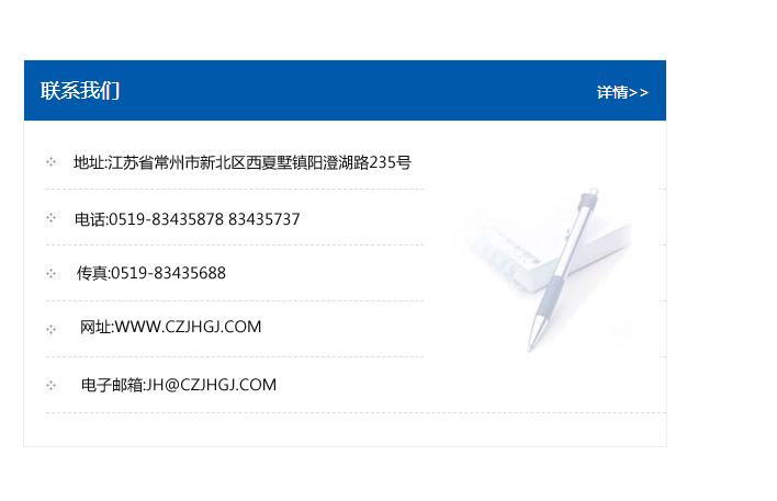 地址:常州市新北區友邦商務大廈1幢16、17層  電話:0519-85101652  傳真:0519-85112595  郵編:213022  網址:www.cz-jiayue_cn.szsnt01.com  郵箱:xiajifengaa@163.com